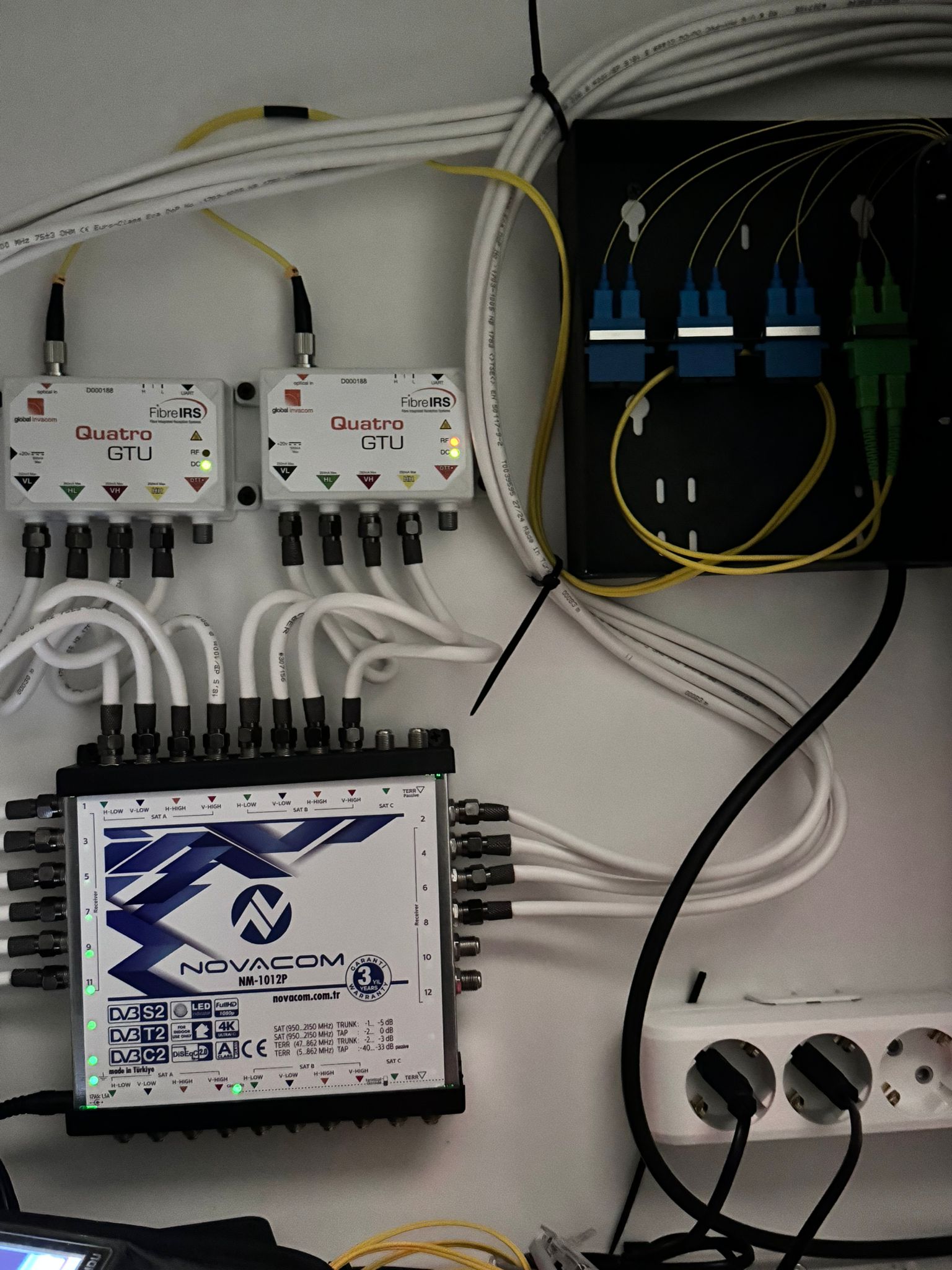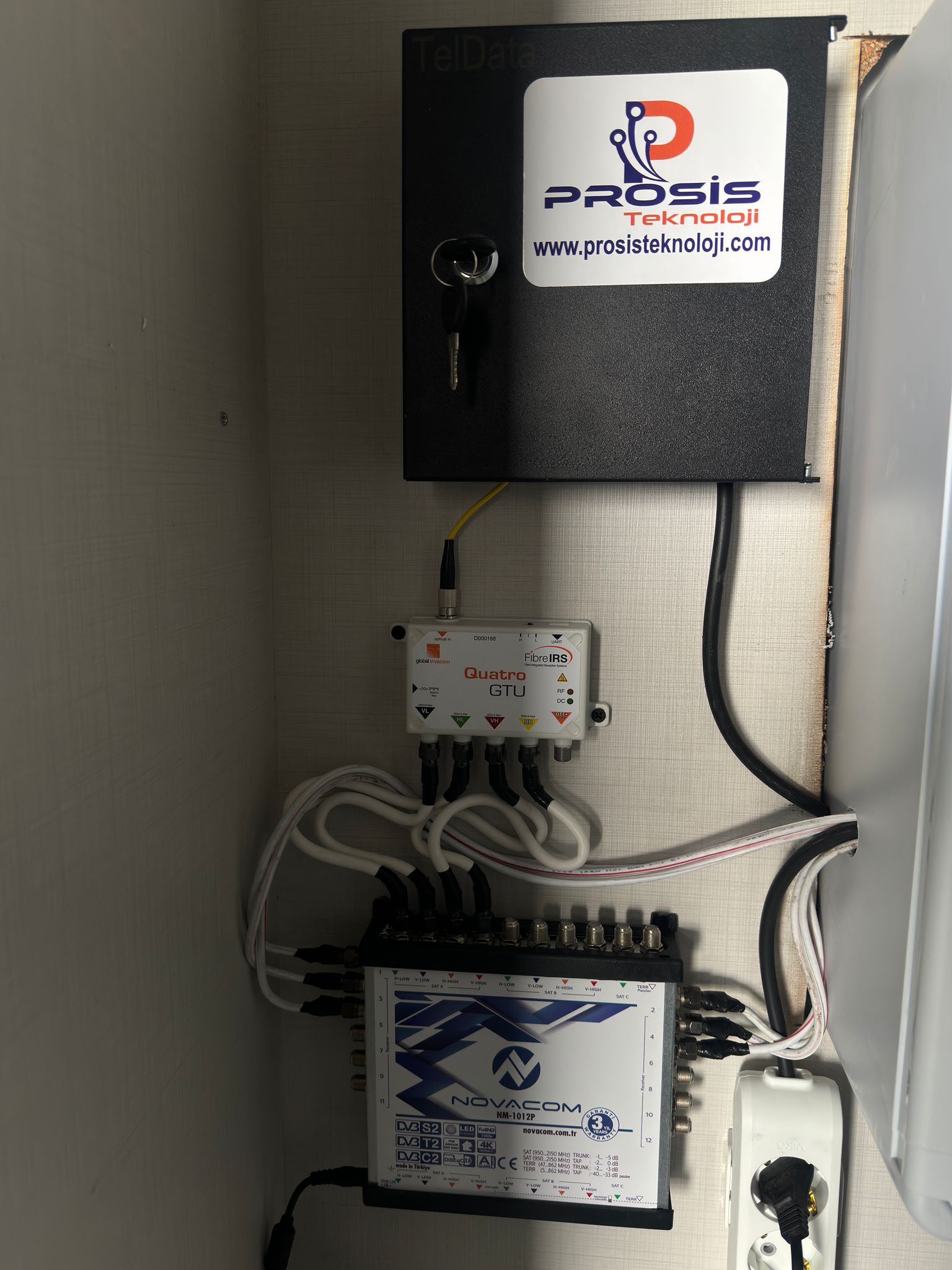 Fiber Optik Uydu Dağıtım Sistemlerinde, antenden alınan veri Fiber-Optik LNB ile optik sinyallere dönüştürülür. Standart sistemde 4 tane RG6 veya RG11 kablo ile taşınması gereken sinyal tek bir kıl fiber ile taşınabilecek hale gelir. Fiber optik sinyal nokta sayısına göre fiber splitter kullanılarak bölünür. Standart bölücülerde oluşan gürültü ve bozulmalar fiber optik bölücülerde yoktur. Bölünen sinyaller alıcı noktalara fiber optik kablolar ile ulaştırılır. Uzak mesafelerde kullanılması gereken yükselticilere fiber optik sistemde ihtiyaç yoktur, merkezden çıkan fiber optik kablo doğrudan son noktaya bağlanır. Alıcı noktalarında dağıtım türüne göre Quad veya Quattro GTUlar ile tekrar elektrik sinyaline dönüştürülüp dağıtılır. Bu sayede uzak mesafeden kaynaklı veri kayıp ve bozulmaları en aza indirildiği gibi kablo ve aktif eleman maliyeti de en aza indirilmiş olur.